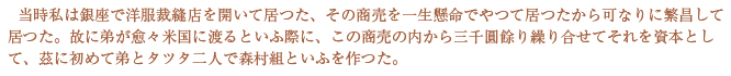 テーラーの創業年については諸説ある。明治37年の『実業の栞』には、「明治維新前に開業し今なお継続している洋服裁縫店」の一つとして挙げられている。一方、昭和2年の『商工組合年鑑』を見ると、モリムラ・テーラーは「創業明治四年」となっている。いずれにせよ、銀座四丁目一番地(現在の教文館の位置)に落ち着いたのは、明治6年の銀座の煉瓦街完成以降のことである。なお、明治27年の『東京諸営業員録』には、「洋服裁縫部」の項に「洋服裁縫・フランネル 森村組 銀座四ノ一」と出てくる。